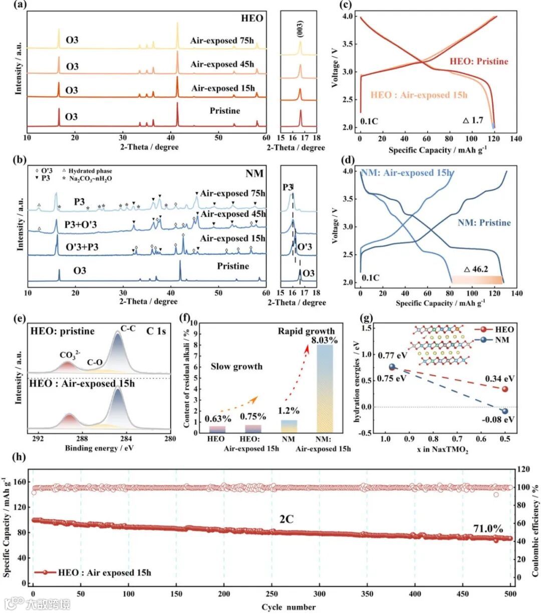 图5. (a,b)HEO和NM样品在原始状态和暴露于空气后的XRD图谱。(c,d)HEO和NM样品在暴露空气15小时后的典型充放电曲线。(e)原始状态和暴露于空气后的HEO样品中C 1s的XPS图谱。(f)暴露于空气前后残碱的含量。(g)基于NaxMO2(x = 0.97和0.5)结构模型计算的水合能,插图为水分子嵌入层状氧化物的示意图。(h)暴露于空气中15小时的HEO样品在2 C倍率的循环性能。