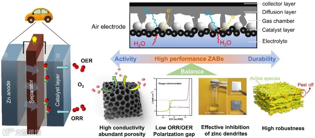 图2. ZABs结构示意图及对高活性稳定电催化剂的要求。