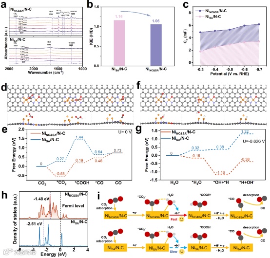 为了探究CO2还原为CO的机理,研究团队进行了原位实验和理论计算。ATR-SEIRAS结果表明,在NiNC&SA/N-C催化剂上,*COOH中间体的信号更为显著,同时*H2O的吸附峰也有所增强。通过同位素标记实验发现, NiNC&SA/N-C上的水解离显著加快;电化学原位阻抗测试更验证了在该催化剂表面上具有较高的氢覆盖率,从而加速了CO2的质子化过程,提升了CO选择性。DFT计算进一步显示,Ni团簇与单原子协同作用,降低了CO2CO2的能垒,并加速了水的吸附与解离过程,从而提高*COOH中间体的形成速率,提高CO2到CO转化效率。
