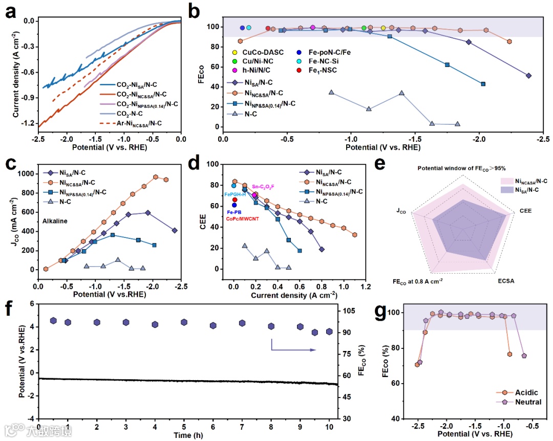 NiNC&SA/N-C催化剂展现了非常优异的CO2RR性能(图3)。在碱性条件下,该催化剂在电流密度为 0.1 至 1.0 A/cm² 的超宽电位窗口内(−0.39 至 −2.05 V vs RHE),保持了 95% 以上的 CO 选择性,最高可达 100%。此外,在中性和酸性条件下,催化剂在广泛的电流密度范围内也能保持较高的 CO 选择性,进一步验证了其出色的 pH 适应性和应用潜力。