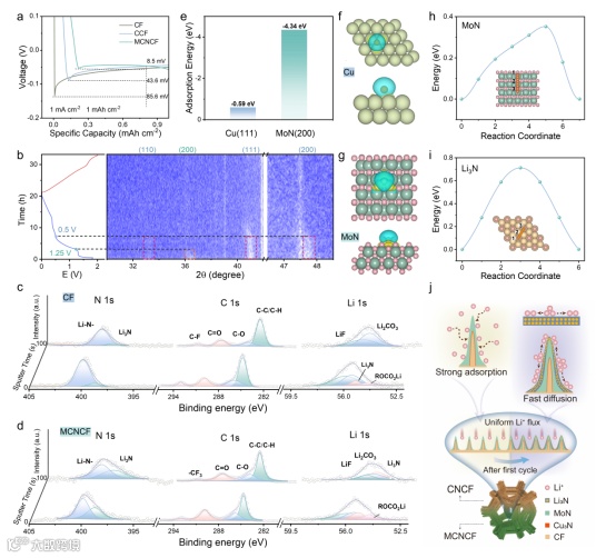 在初始锂沉积过程中,Cu3N和MoN与锂发生反应,生成富含Li3N的SEI层。这种富Li3N的SEI具有高离子导电性和低电子导电性,可以促进锂离子的快速传输,并为均匀的锂沉积提供丰富的成核位点。理论计算表明,MCNCF电极由于其强吸附和快速扩散特性,是抑制枝晶形成和稳定LMAs的有效方法。