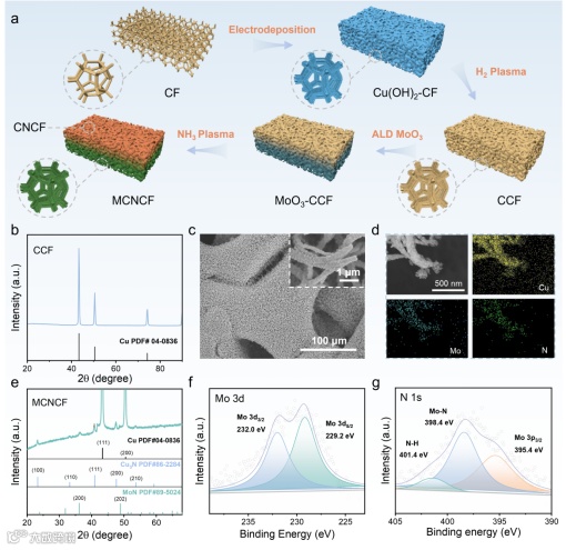 本研究通过原子层沉积和等离子处理技术,在泡沫铜表面制备了具有亲锂梯度结构的三维MCNCF骨架。该结构由Cu3N纳米线和底部的MoN层组成,形成了从底部到顶部的亲锂性梯度。这种设计可以引导锂离子向底部迁移,促进均匀的锂沉积。此外,在CF骨架上引入纳米线结构,降低了阳极电流密度,减轻了循环过程中的体积变化。
