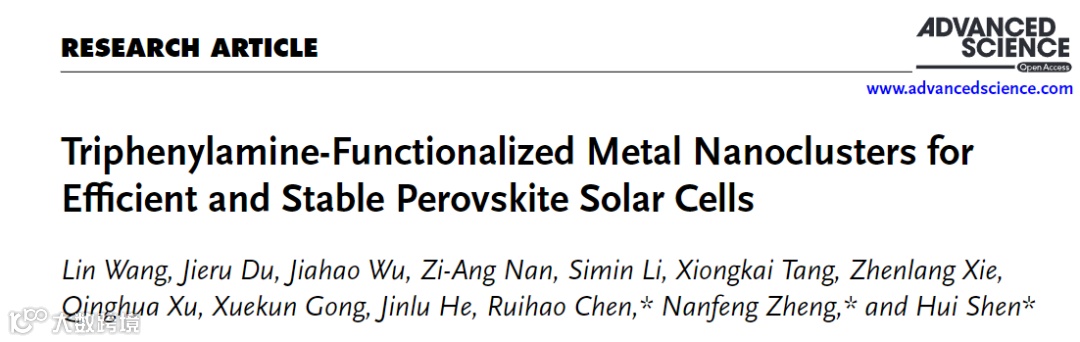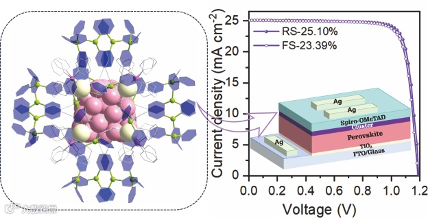 近日,在前期团簇表界面性质探究的工作基础上,内蒙古大学沈慧、厦门大学郑南峰和西北工业大学陈睿豪三个研究团队通力合作,成功制备出三苯胺修饰的[(AgCu)37(PPh3)8(TPA-C≡C)24]5+纳米团簇,并将其作为界面层应用于钙钛矿太阳能电池,其功率转换效率突破25.1%。相关研究成果发表在Advanced Science,题目为“Triphenylamine-Functionalized Metal Nanoclusters for Efficient and Stable Perovskite Solar Cells”。
