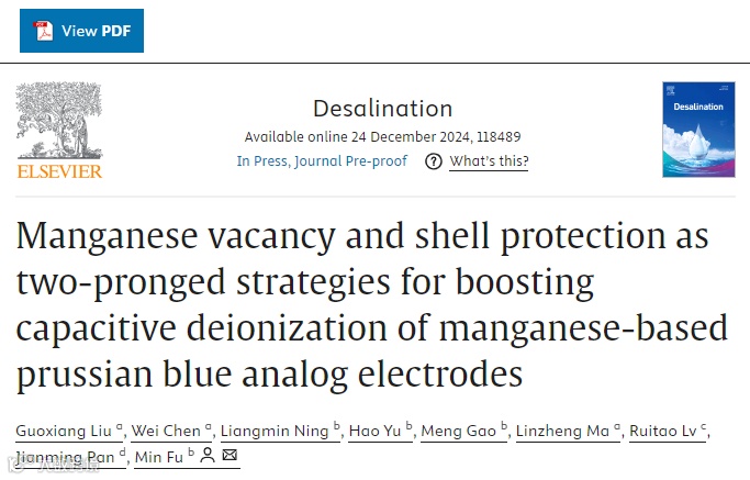 题目Manganese vacancy and shell protection as two-pronged strategies for boosting capacitive deionization of manganese-based prussian blue analog electrodes
