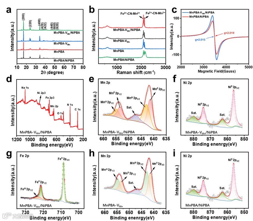 图3. 四种电极的(a) XRD,(b)拉曼图谱;(c)MnPBA-VMn/NiPBA,MnPBA/NiPBA的ESR图谱;(d,e,f,g)MnPBA-VMn/NiPBA的XPS图谱;(h,i) MnPBA-VMn, MnPBA/NiPBA的XPS光谱。