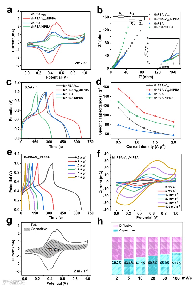 该研究通过EDTA和Mn2+之间的强螯合作用将锰空位引入锰基普鲁士蓝材料,然后再通过离子交换策略在MnPBA-VMn的表面制备了了NiPBA保护壳,最终得到了含锰空位以及核壳结构的PBA(MnPBA-VMn/NiPBA)。多种结构表征手段证实了这种结构的成功构建。金属阳离子空位以及核壳异质外壳的存在促进了离子吸附,强化了电荷/离子传输特性。