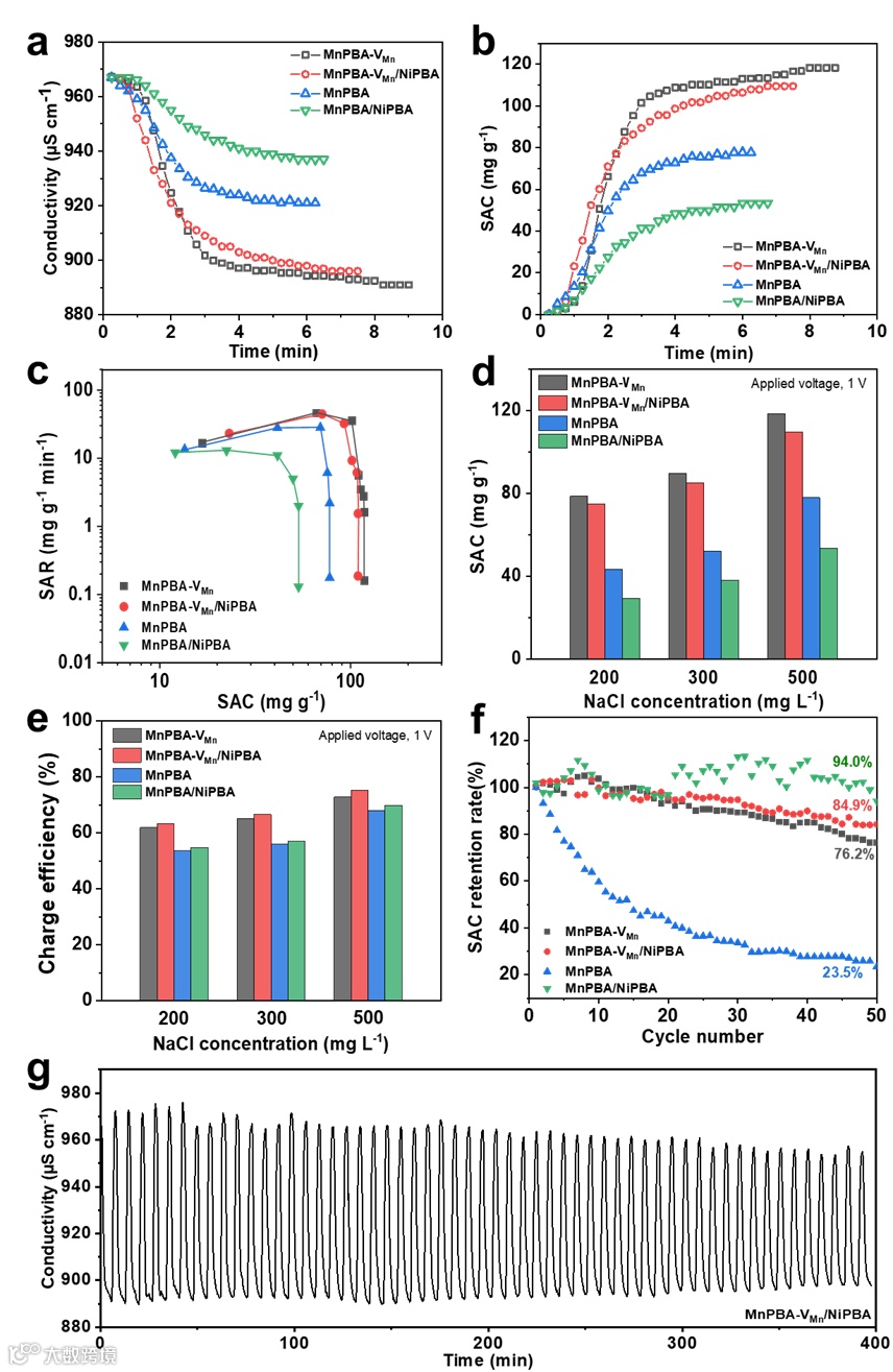 该研究通过简单的两步策略制备了含锰空位以及核壳结构的锰基普鲁士蓝类似物(MnPBA-VMn/NiPBA)。锰空位(VMn)的存在可以抑制MnPBA的Jahn-Teller畸变,从而缓解结构形变以提高其循环稳定性。另一方面,NiPBA保护壳的存在可以抑制锰基材料中锰离子的浸出。锰空位和镍普鲁士蓝外壳的存在,不仅提升了材料的稳定性,还改善了其电化学性能,加速了离子传输和电荷迁移。这种结构特性赋予了电极材料更好的电化学表现,所合成的MnPBA- VMn/NiPBA电极在50次循环后表现出高达109.44 mg g-1的除盐量和84.9%的脱盐保持率。这项工作为基于普鲁士蓝类似物的结构调控提供了新的见解,并为用于海水淡化应用的有前景的电容去离子电极的设计提供了启示。