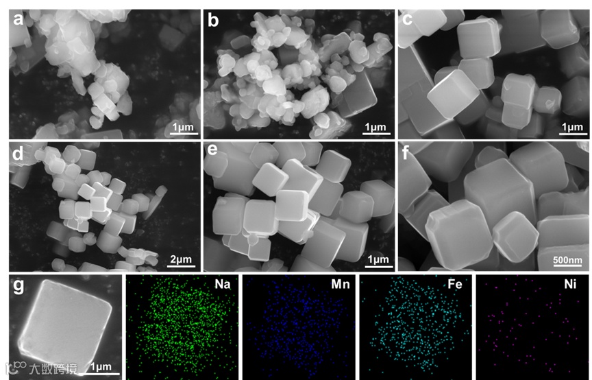 图2. (a)MnPBA,(b)MnPBA/NiPBA,(c)MnPBA-VMn,(d,e,f,g)MnPBA-VMn/NiPBA的形貌表征。