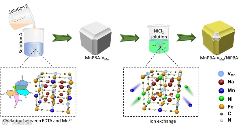 图1. MnPBA-VMn/NiPBA材料的合成示意图。