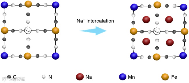 锰基普鲁士蓝材料常面临锰离子溶出以及吸脱附过程中较大的体积形变等问题。稳定的镍普鲁士蓝外壳隔绝了锰基普鲁士蓝与盐溶液,不但避免了锰离子溶出问题,而且能在一定程度上抑制锰普鲁士蓝的体积形变。EDTA的强螯合作用减缓了MnPBA-VMn的生长速度,不仅造就了大量的锰空位,还减少了Fe-C-N(VFeCN)空位。锰空位的存在缓解了锰基普鲁士蓝在钠离子嵌入/脱出过程中的体积变化。由于VMn比VFeCN小得多,VMn在一定程度上又抑制了Mn-N键的运动,防止了由于Mn-N键过度拉伸而导致的断裂。因此,锰空位的存在增强了MnPBA-VMn的稳定性。