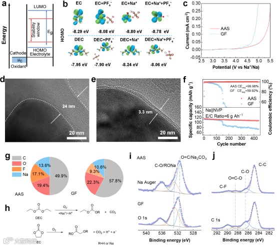 阴离子使溶剂的氧化稳定性降低,这影响了CEI的稳定性。线性扫描伏安法(LSV)表明阴离子限域后会使氧化电位升高,有效减轻了电池正极侧的寄生反应。同时配备AAS时形成了更加薄且均匀的CEI。当电解质/容量(E/C)比严格控制在6 g Ah−1时(图5f),Na|AAS|NVP电池的初始放电容量高达107.88 mAh g−1,经过400次循环后,容量保持率超过93.59%,平均CE为99.98%。而Na|GF|NVP电池的初始放电容量为112.77 mAh g−1,在第170个循环时逐渐降至约88 mAh g−1。Na|AAS|NVP电池表现出的稳定性可归因于AAS降低了正极失效的风险,并减轻了电解液中的副反应。为了进一步阐明AAS诱导产生稳定CEI的机制,对负极进行了X射线光电子能谱(XPS)测试(图5i,5j)。结果显示,与AAS体系相比,在GF体系中形成的CEI膜有机物含量高,无机物含量低,这意味着在GF中形成的CEI层更厚,抗性更强,表明该策略能有效提高溶剂的氧化稳定性,从而生成均匀稳定的CEI。