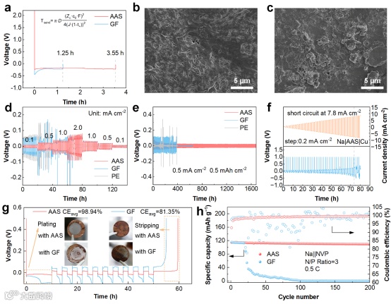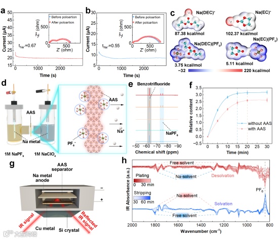 开发了一种结合核磁共振(NMR)的希托夫法,以分析电场作用下的离子传输过程,并在时间尺度上量化了阴离子的迁移动力学(图2d)。在传输开始时,PF6−的浓度迅速增加。在有AAS的情况下,系统更快达到稳定状态(图2f)。结果证实了AAS可以有效抑制PF6−的传输。虽然这种方法存在隔膜与电解液的体积比不现实的局限性。但是这也表明AAS对阴离子的锚定效果可能比测试结果更好。同时,利用原位衰减全反射傅立叶变换红外光谱(ATR-FTIR)进一步验证了AAS对离子传输动力学的影响。据观察,使用AAS时,PF6−达到平衡的时间(40分钟)比使用GF时(12分钟)长,这是因为AAS有效地锚定了阴离子。此外,Na-溶剂达到平衡的速度更快,表明Na+转移过程更快。这可能是由于界面上阴离子积聚减少,从而降低了钠离子的传输能垒。