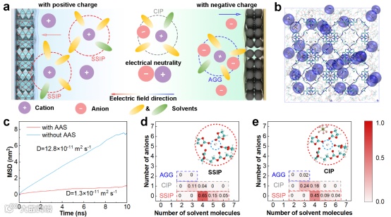 在放电过程中,游离的钠离子和SSIP带有正电荷,在电场的影响下向正极迁移,促进电流传输。同时,含有两种或两种以上阴离子和游离阴离子的聚集体(AGG),带有负电荷,会向负极迁移,从而对电流传输产生负贡献(图1a)。这表明阴离子降低了Na+对电极电流传输的贡献,增加了电池的内阻。针对上述问题,精心设计了一种阴离子锚定隔膜(AAS)以调控电池中的体相溶剂化结构,通过溶剂化团簇化学计量概率密度分析了Na+的溶剂化结构。结果证明所提出的阴离子锚定策略有效地限制了阴离子并促进了SSIP的形成,SSIP可作为主要电荷载体,从而有可能提高SIB中的电荷转移动力学。