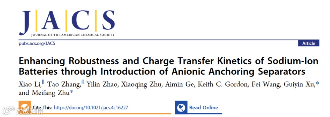 基于此,东华大学朱美芳院士/徐桂银教授团队提出基于隔膜材料优化溶剂化结构的策略。通过开发阴离子锚定隔膜,有效锚定电池体相中的游离阴离子,减少阴离子在系统中的迁移,从而提高钠离子的扩散通量。此外,还开发了一种结合核磁共振技术的希托夫法,以分析电场作用下的离子传输过程,在时间尺度上量化阴离子的迁移动力学。离子迁移动力学的结果证实开发的阴离子锚定隔膜有效减少迁移到正极的阴离子,能够有效削弱阴离子的溶剂化效应,增加溶剂化结构中溶剂分离离子对(SSIP)的比例。证实了减少迁移到正极的阴离子,削弱阴离子的溶剂化效应,增加溶剂化结构中溶剂分离离子对(SSIP)的比例。该工作以“Enhancing Robustness and Charge Transfer Kinetics of Sodium-ion Batteries through Introduction of Anionic Anchoring Separators”为题发表在Journal of the American Chemical Society期刊上。