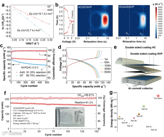 在0.5 C下,HC|AAS|NVP全电池在循环过程中表现出更小的容量衰减,达到了91.35%的容量保持率,且平均库仑效率为99.5%。与此同时,还组装了HC|AAS|NVP软包电池,在0.2 C时的能量密度高达225.7 Wh kg−1(基于整个电池的质量)。此外,HC|AAS|NVP软包电池还表现出高容量(176 mAh)和优异的循环稳定性。总之,AAS使钠离子电池能够在使用贫电解质与高正极负载的同时确保循环稳定性。这减少电池中非活性成分的体积和质量,从而降低了成本,提高了能量密度,为长循环的高能钠离子电池提供新的技术方案。