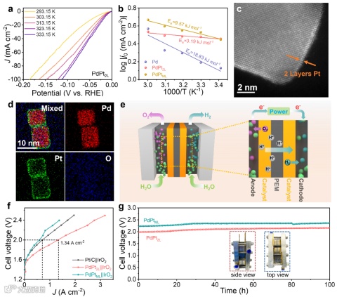 PdPt2L||IrO2在质子交换膜水电解槽中表现出优于Pt/C||IrO2和PdPtML||IrO2的性能,并且在500 mA cm2的电流密度下稳定操作100小时。原位测试技术表明,弱应变效应的PdPt2L表现出更低的表观活化能,具有更快的吸附和脱附动力学。DFT计算揭示了无应变效应的Pt表现出更强的H*吸附能,不利于HER的进行。与PdPtML相比,PdPt2L表现出更接近于热中性的H*吸附能,利于H*的脱附,证实了弱应变效应的优势,
