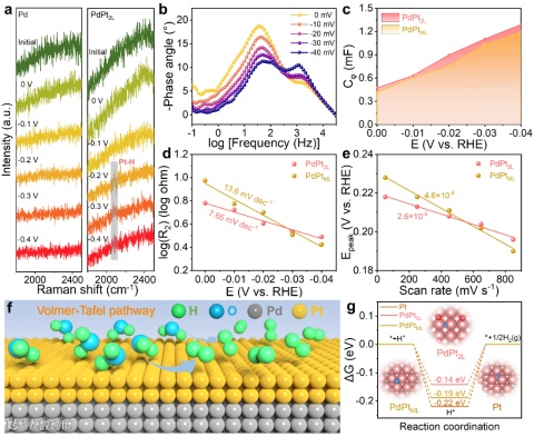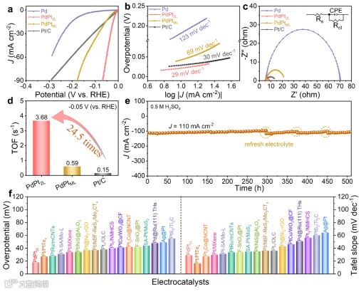 在酸性条件下对样品进行了析氢性能评估。具有弱应变效应的PdPt2L在HER中达到10 mA cm-2仅需要18 mV,优于PdPtML的43 mV。并在110 mA cm-2表现出510小时的长时间稳定性。PdPt2L的TOF值分别是PdPtML和商业Pt/C催化剂的6.2和24.5倍。