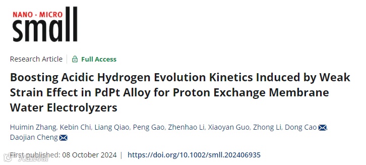 H. Zhang, K. Chi, L. Qiao, P. Gao, Z. Li, X. Guo, Z. Li, D. Cao, D. Cheng, Boosting Acidic Hydrogen Evolution Kinetics Induced by Weak Strain Effect in PdPt Alloy for Proton Exchange Membrane Water Electrolyzers. Small 2024, 2406935.
