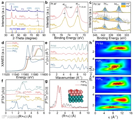 XRD峰的偏移证实了合金中晶格应变的存在。XPS结果分析表明PdPt2L中Pd和Pt具有更强的电子相互作用。同时同步辐射XAS对样品中Pt的配位环境进行了详细分析,并表明了PdPt2L中Pt相比于PdPtML具有更高的氧化态和更低的电子密度。