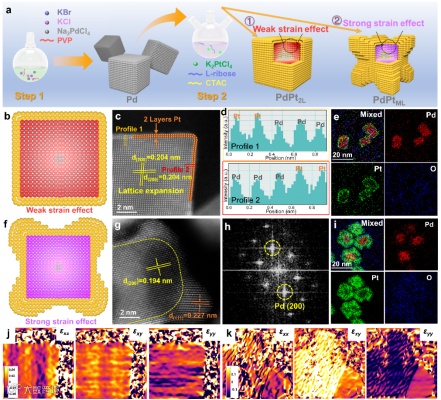 通过外延生长法调控出了壳层厚度分别为两层Pt和多层Pt的PdPt合金催化剂,进一步证明了PdPt2L和PdPtML分别表现出约为4%和20%的应变效应。