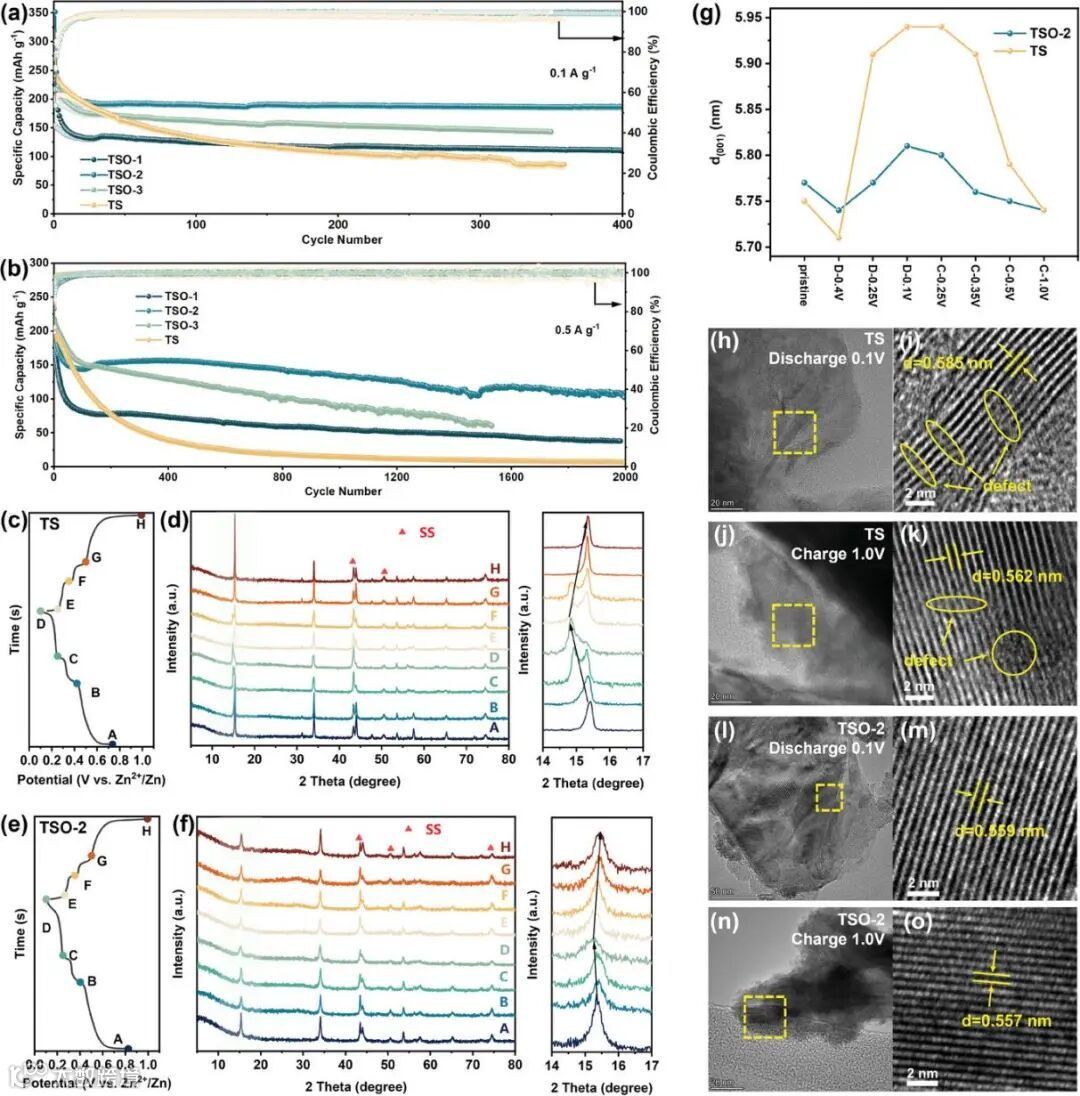 研究了不同电极在充放电循环过程中的性能,特别是锌离子嵌入/脱出对电极稳定性的影响。在0.1 A g−1的电流密度下, TS电极在360圈充放电循环后显示了83.4 mAh g−1的电荷比容量。相比之下,异质结构电极TSO-2在400个循环后达到了185.0 mAh g−1,表现出极好的可逆性(CE为99%)和98.2%的容量保持率。通过XRD和HRTEM等技术分析了电极在充放电过程中的结构变化,结果显示,TS电极在锌离子的嵌入和脱出过程中出现了显著的晶格膨胀和结构破坏,而TSO-2电极则保持了良好的结构稳定性和较低的晶格膨胀率(0.68%),显示出其卓越的电化学性能。这项研究表明,构建异质界面能够有效改善电极的循环稳定性,促进锌离子脱溶和扩散过程,从而实现长效的循环寿命。