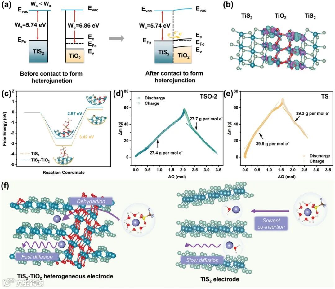 水性锌离子电池(ZIBs)因其安全性、可持续性和环保性在能源存储和电动汽车领域中展现出巨大潜力。然而,锌离子在水性电解液中倾向与水分子形成水合结构([Zn(H2O)6]2+, 8.6 Å),导致嵌入/脱出过程中的溶剂共嵌入现象,进而影响了电极材料的反应动力学和循环稳定性。目前,优化电解液成分,减小锌离子与溶剂水分子的相互作用被认为是改善这一现象的有效策略,然而引入新的成分损害了水相介质的安全性和离子电导率。从电极材料的结构调控入手,通过构建富含亲水性功能团的界面以及具有纳米孔的界面,为Zn2+和溶剂水分子的分离提供了作用力,可以加速锌离子的脱溶剂过程。异质结构的内建电场(BIEF)被广泛报道能够促进定向迁移和电荷载流子的分离。构建异质结构涉及两个晶体结构和原子间距相似的纳米晶体。纳米晶体之间的能带结构和费米能级差异导致形成内建电场,电子和空穴在界面重组,为界面电荷转移提供驱动力。当电极与电解质之间的界面存在内建电场时,为荷电的Zn2+和电中性水分子提供分离力,从而促进去溶剂化过程。基于此,本文提出了一种独特的TiS₂-TiO₂异质结构,旨在提高界面脱溶剂过程和体相离子扩散动力学,从而优化电荷存储性能。这种新型结构不仅降低了水合Zn2+的脱溶剂化能垒,还提升了Zn2+的扩散能力,实现了5A g-1电流密度下160.9 mAh g⁻¹的高倍率性能和2000次循环的超长循环寿命,为高倍率“摇椅型”锌离子电池负极的构建提供了新的思路。