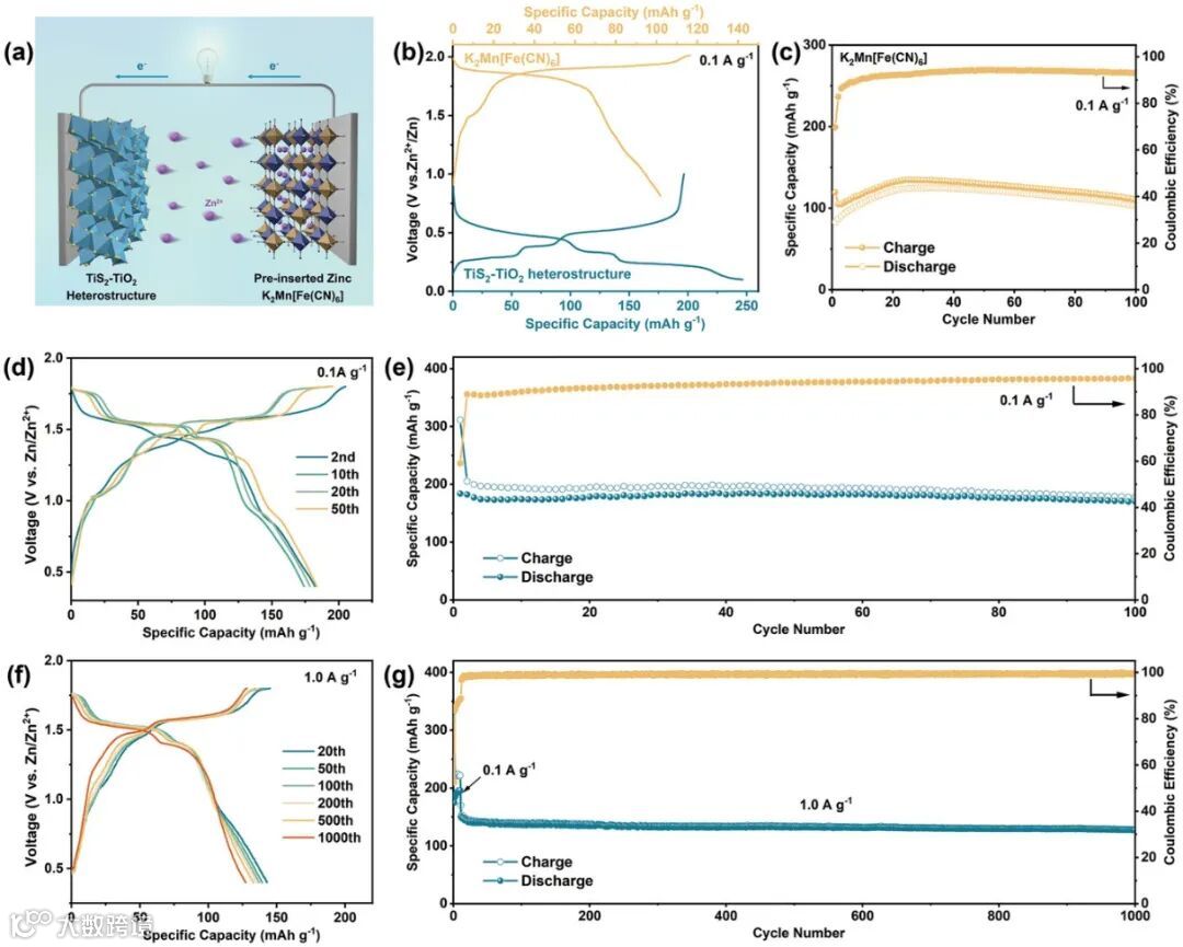 为了探讨了TiS2-TiO2异质结构的可行性,组装了以TSO-2为负极和预嵌锌的ZnFeHCF为正极的“摇椅”型全电池。优化的正负极质量比为约2.3:1。电池的放电容量达183.8 mAh g−1,能量密度超过60.8 Wh kg−1,并在0.1 A g−1的电流密度下保持92.5%的容量保持率,1.0 A g−1时仍保持151.2 mAh g−1的容量,且在1000个循环中无显著衰减。这表明异质结结构设计能有效构建具有高电化学可逆性和长循环稳定性的“摇椅”型锌离子全电池。