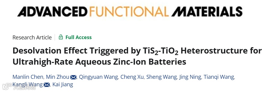 近日,来自华中科技大学的王康丽教授与周敏副教授,在国际知名期刊Advanced Functional Materials上发表题为“Desolvation effect triggered by TiS2‐TiO2heterostructure for ultrahigh‐rate aqueous zinc‐ion batteries”的观点文章。