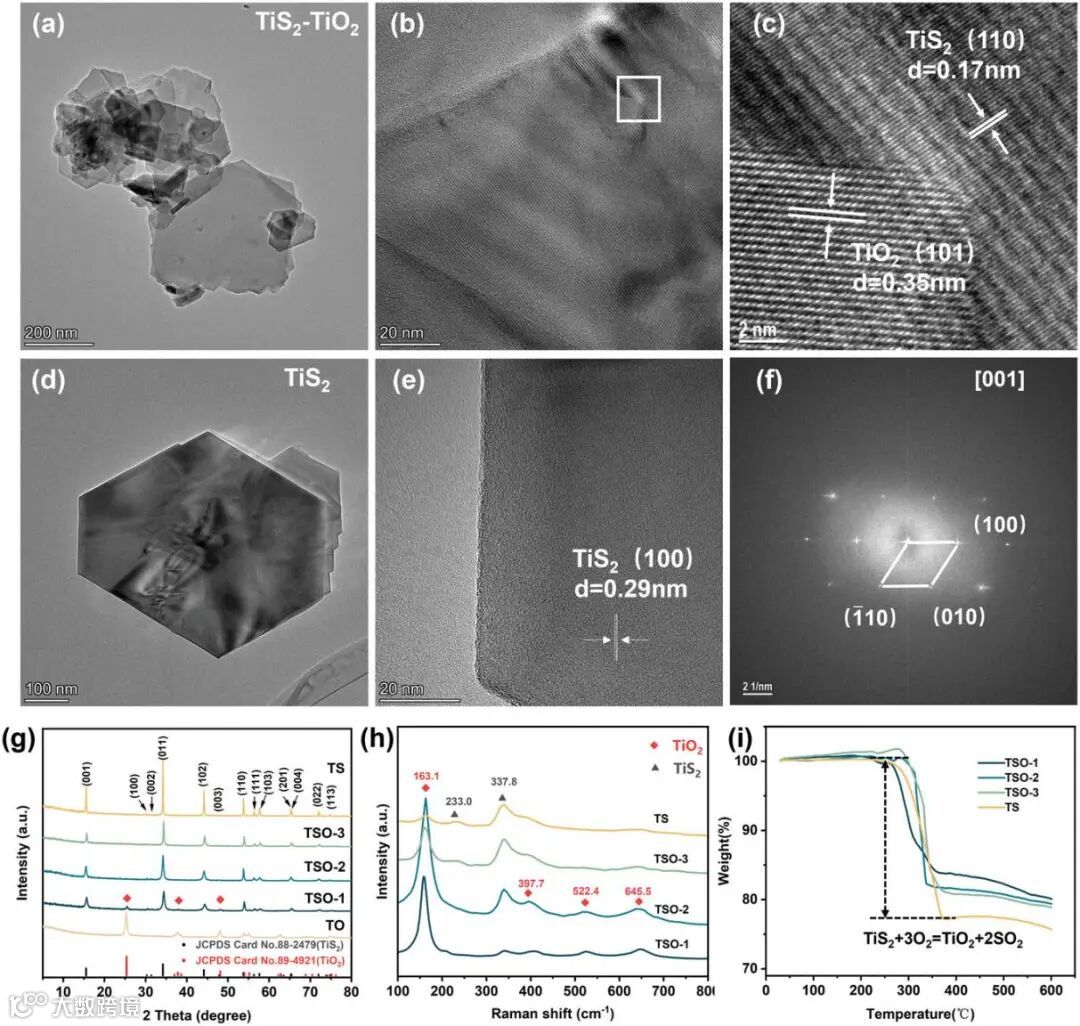 本研究通过在不同的合成温度、时间和反应物比例条件下,将商业锐钛矿二氧化钛(TiO2)与二硫化碳(CS2)反应进行原位硫化,成功制备了TiS2-TiO2异质结。这一过程中,CS2能够吸附于TiO2表面,并通过气相阴离子交换过程将氧离子替换为硫离子,形成TiS2相。在不同的热处理条件下,获得了不同的TiS2-TiO2异质结构,样品的形态和微观结构通过透射电子显微镜(TEM)表征,结果显示了异质界面的存在。X射线衍射(XRD)和拉曼光谱(Raman)进一步验证了材料的物相信息,表明随着硫化温度的增加,TiO2的含量和结晶性下降。热重分析(TGA)确定了异质结构中两种组分的质量比。最终,研究结果表明, TSO-2异质结构通过调控硫化条件成功获得,有望提升材料的电子和离子传输速率,增强其速率性能和稳定性。