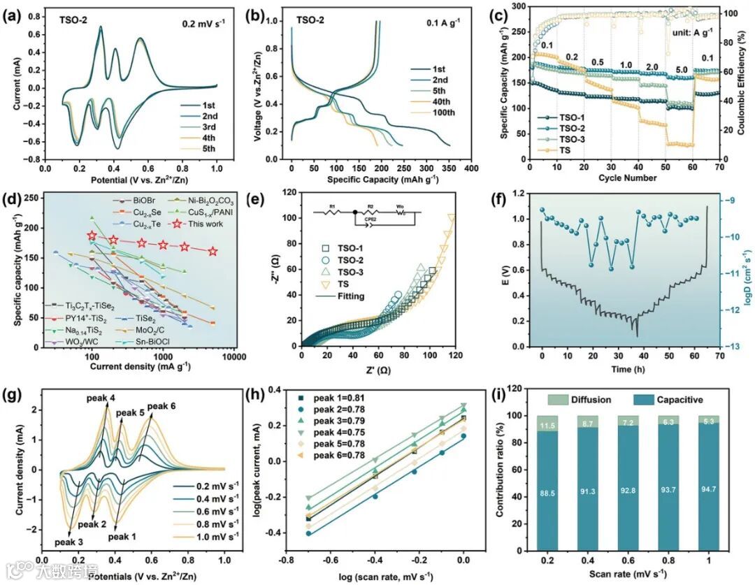 在2.0 M Zn(CF3SO3)2中对异质结构材料进行电化学测试时,发现TSO-2电极在电流密度为0.1 A g−1时表现出188.3/351.9 mA h g−1的初始充/放电容量。讨论了TiS2-TiO2异质结构电极的优异倍率性能,尤其是TSO-2电极,该电极在电流密度增加时表现出高达187.7 mA h g−1的可逆电荷容量,并在5 A g−1下仍保留85.5%的容量,明显超越了其他电极样品。通过电化学阻抗谱(EIS)分析,TSO-2的电荷转移电阻(Rct)为40.1Ω,显著低于其他样品,表明界面去溶剂化过程加快,导致较低的电荷转移阻抗,从而提升了倍率性能。此外,GITT测量显示,TSO-2的扩散系数 (D) 在10−9-10−11 cm² s−1之间,远高于其他样品,表明其内部电场的设计促进了离子的快速传输。并且TSO-2电极表现出高赝电容特性,显示出卓越的倍率。高倍率特性与其异质微结构的精细设计有关,该设计促进了快速去溶剂化和快速离子传输,从而提高电极反应动力学。