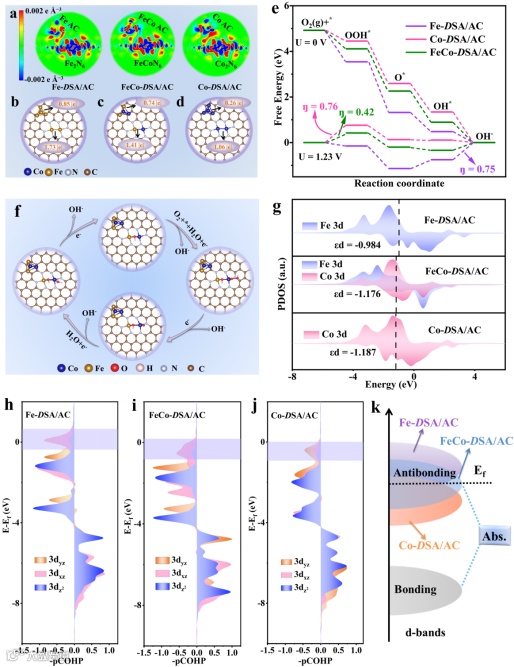 研究人员提出了一种创新的团簇锁定策略,该策略利用共价有机聚合物对三核团簇进行限制,并通过金属原子交换,通过热解方法成功实现了一系列FeCo(包含Fe或Co)双单原子(DSA)与原子团簇(AC)共存结构(即FeCo-DSA/AC)的多组分催化剂精准合成。实验结果显示,相较于Fe及 Co双单原子催化剂,所设计的FeCo-DSA/AC催化剂在氧还原反应的半波电位上分别高出18mV和49mV,且在锌空气电池应用中展现出了卓越的性能。通过全面的分析与理论模拟,进一步揭示了FeCo-DSA/AC催化剂活性增强的内在机制:通过对dz²和dxz轨道以及接近费米能级的O 2p轨道杂化的精妙调控,有效调整了活性中心的反键态,从而加速了OH*中间体的脱附与OOH*中间体的形成,进而显著提升了催化活性。本研究不仅深刻阐明了复合电催化剂中活性位点的协同增效作用,更为单原子-团簇电催化剂的创新设计与精准合成提供了全新的思路与策略。