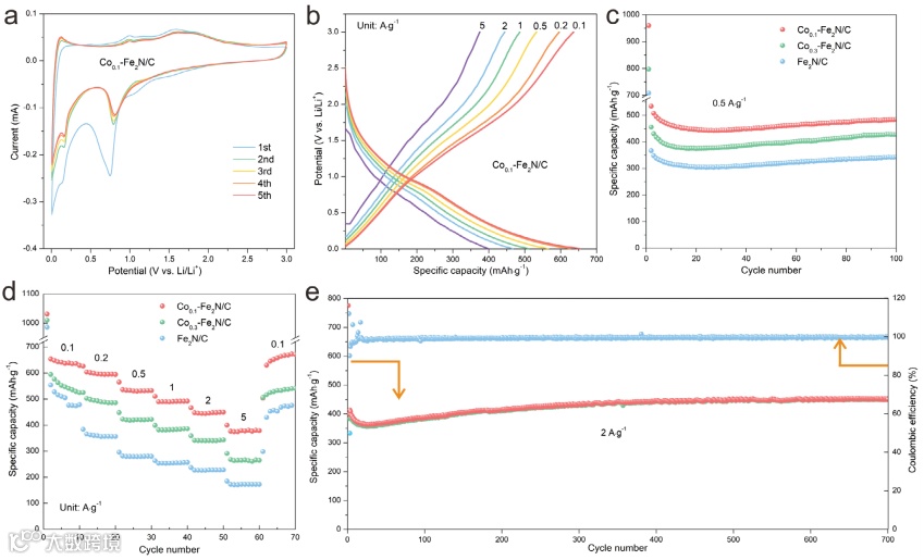 图4.a) Co0.1-Fe2N@C负极在扫描速率为0.2 mV s−1时的后续cv;b) Co0.1-Fe2N@C负极在不同电流密度下的恒流充放电曲线;c) 0.5 A g−1电流密度下Fe2N@C、Co0.1-Fe2N@C和Co0.3-Fe2N@C负极的恒流充放电曲线;d)在0.1 ~ 5 A g−1不同电流密度下获得的Fe2N@C、Co0.1-Fe2N@C和Co0.3-Fe2N@C的速率能力;e)电流密度为2 A g−1时Co0.1-Fe2N@C的循环稳定性和库仑效率。
