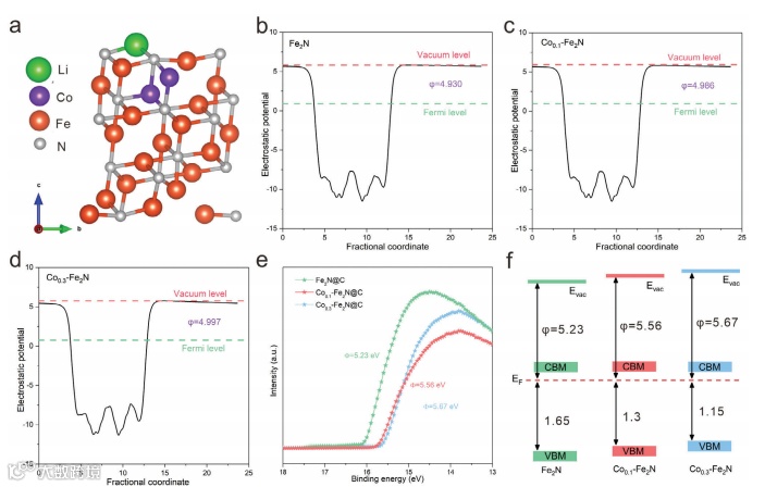 图1.a) Cox-Fe2N的分子结构模型示意图;b - d) Fe2N@C (b)Co0.1-Fe2N@C (c)Co0.3-Fe2N@C (d)的功函数计算值;e) Fe2N@C、Co0.1-Fe2N@C、Co0.3-Fe2N@C的UPS测量截止区域;f) Fe2N@C、Co0.1-Fe2N@C和Co0.3-Fe2N@C的能量图。