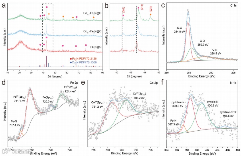 图3.a,b) Fe2N@C、Co0.1-Fe2N@C和Co0.3-Fe2N@C的XRD图;Co0.1 -Fe2N@C的XPS中的c) C 1s精细谱,d) Fe 2p精细谱,e) Co 2p精细谱,f) N 1s精细谱。