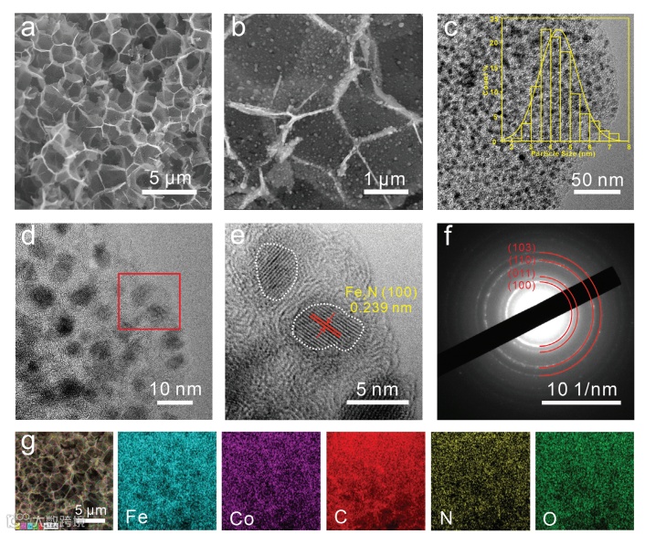 图2.a,b) Co0.1-Fe2N@C不同放大倍数下的SEM图;c-f) Co0.1-Fe2N@C的TEM图、粒径分布图及选区电子衍射图;g) Co0.1-Fe2N@C的SEM图及元素分布图