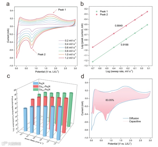 图5. a) Co0.1-Fe2N@C在不同扫速下的循环伏安曲线,b) Co0.1-Fe2N@C相应b值拟合图,c) Fe2N@C、Co0.1-Fe2N@C和Co0.3-Fe2N@C样品在不同扫速下的赝电容贡献柱状图,d)在1.2 mV s–1的扫描速率下Co0.1-Fe2N@C相应的赝电容贡献占比。