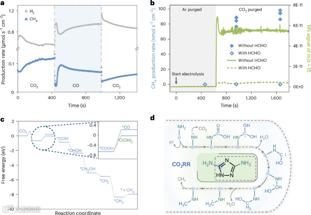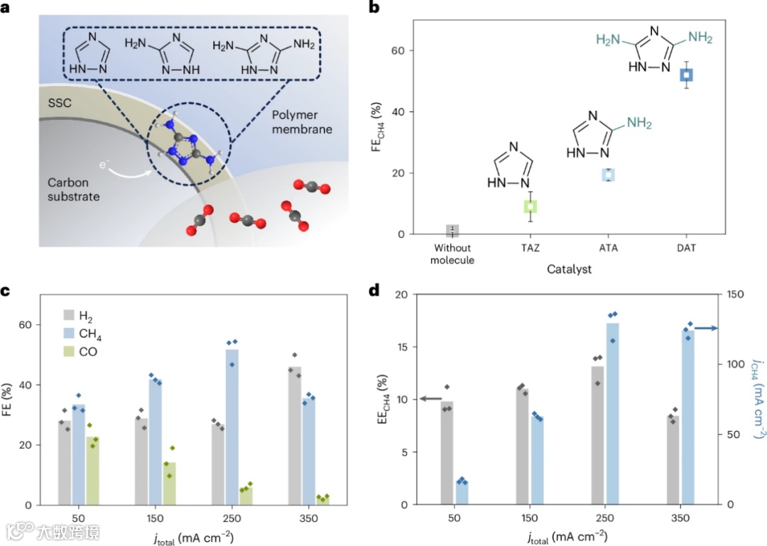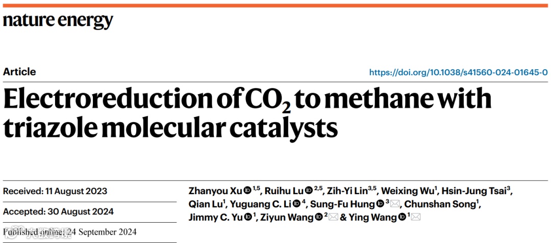 近日,来自香港中文大学的王莹教授与奥克兰大学的王子运博士、国立阳明交通大学的洪崧富教授合作,在国际知名期刊Nature Energy上发表题为“Electroreduction of CO2to methane with triazole molecular catalysts”的研究文章。该文章报道了一种三氮唑分子催化的CO2RR体系,可以在工业相关的电流密度下以52%的法拉第效率将CO2转化为甲烷。经过电极的放大,该分子催化体系可在10 A的总电流下将CO2直接转化为城镇燃气,凸显了分子催化剂在CO2RR实际应用中的潜力。