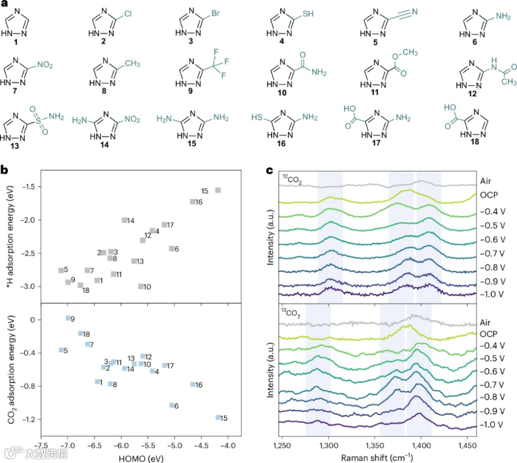 基于CO2分子中碳原子的亲电性,首先选取了一类1,2,4-三氮唑衍生物作为候选催化剂,其富氮环骨架带来的给电子特性可能有利于促进CO2活化。作者总共筛选了18种三氮唑衍生物,每种衍生物都具有不同的官能团。这些官能团可以调控分子的最高占据轨道(HOMO)能级,从而改变其与CO2发生相互作用的能力。在候选者中,3,5-二氨基-1,2,4-三氮唑(DAT)因其分子轨道与CO2分子轨道能级的最佳匹配脱颖而出。同时DAT也具有有利的CO2吸附能和富含电子的氨基,这些氨基可以作为活性位点与CO2结合并促进其活化。原位拉曼光谱进一步证实了DAT上的氨基与CO2的相互作用。