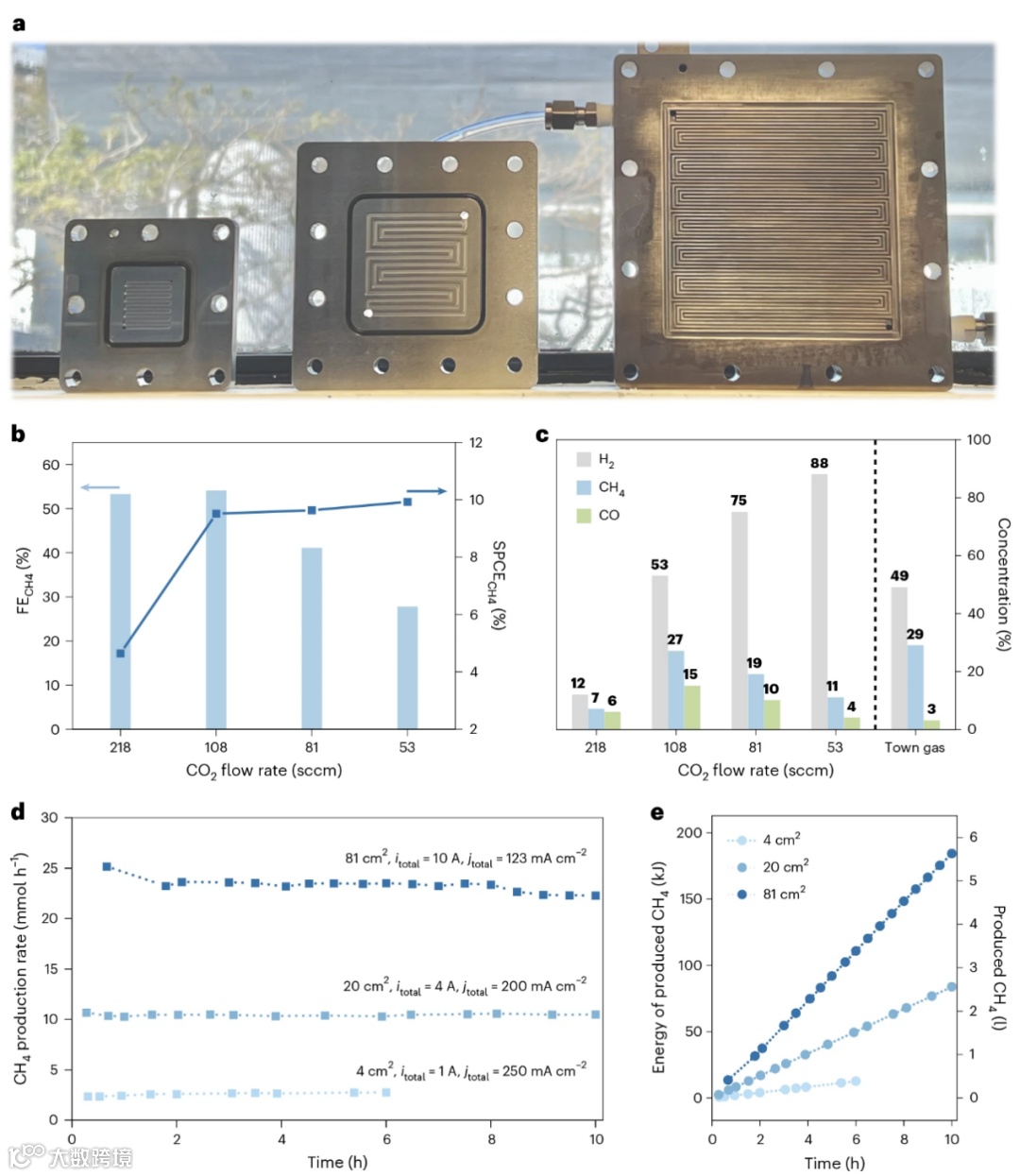 该研究进一步展示了基于DAT的分子催化体系用于CO2转化的规模化潜力。作者将DAT分子电极逐步从4 cm2扩大到81 cm2,并评估了它们在大面积膜电极组件中的CO2RR性能。在总电流为10 A时,81 cm2的DAT电极对CO2到甲烷的转化表现出超过50%的法拉第效率,同时达到约10%的单程碳利用率。值得一提的是,扩大规模的分子催化体系能够直接生产与城镇燃气具有相似成分和浓度的产品,这意味着其无需额外纯化即可用作燃料。在超过10小时的连续运行中,该体系的甲烷产率保持在23.0 mmol h−1左右,并产生了5.6 L甲烷气体。DAT电极的可拓展性展示出分子催化体系在大规模CO2转化中的潜力,为电化学CO2RR走向商业化提供了新路径。