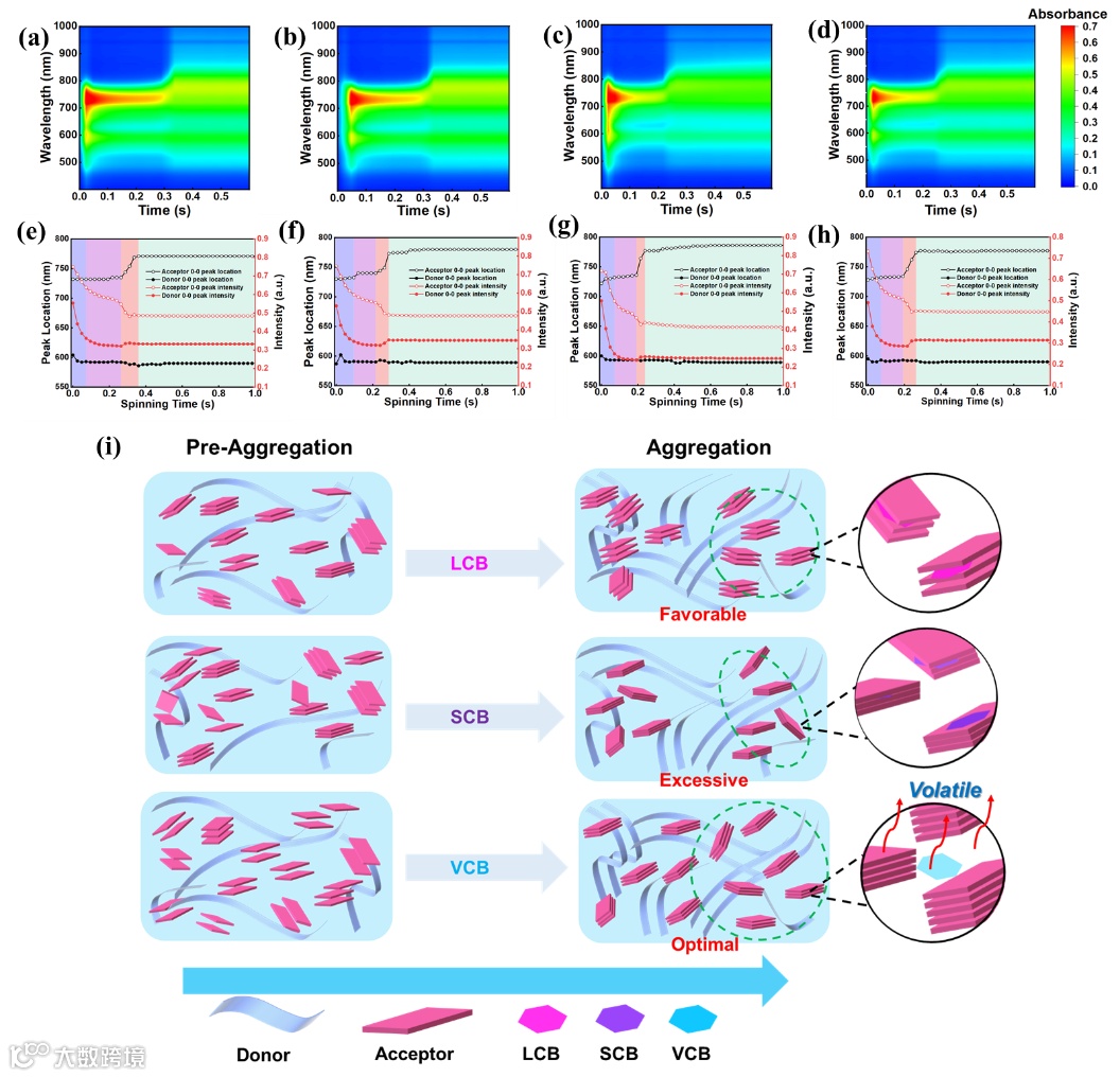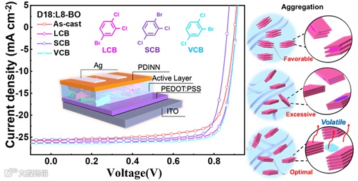 研究结果表明携带高电负性卤素原子的异构添加剂更倾向于与受体L8-BO发生相互作用,而非给体D18。在活性层成膜过程中,1-4-溴-1,2-二氯苯(LCB)作为液态添加剂延长了活性层溶剂的挥发时间,有效抑制了受体分子的过度聚集;1-溴-2,4-二氯苯(SCB)作为固态添加剂显著缩短了活性层分子的聚集时间,获得了最紧密的分子π-π堆积形貌;而2-溴-1,4-二氯苯(VCB)作为挥发性固态添加剂,可以有效调节活性层内的分子间相互作用和结晶行为,促进了最佳的分子自组装与聚集,形成了理想的分子堆叠结构。