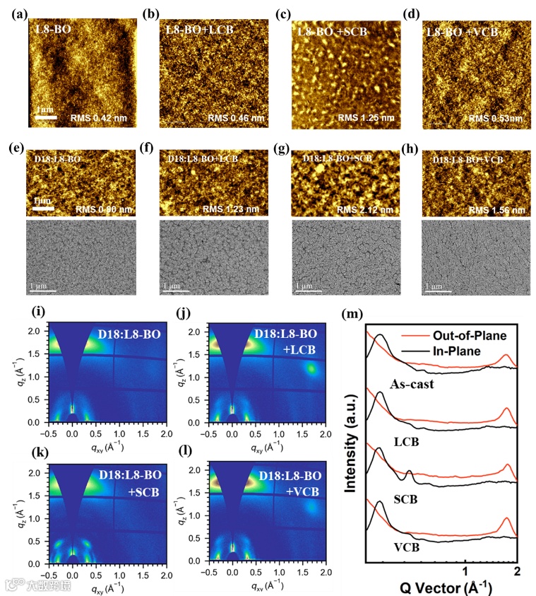 AFM与TEM测试表明,引入添加剂能够有效调节受体的聚集行为,显著改变薄膜的形貌。与LCB和SCB添加剂处理的薄膜相比,经过挥发性固体VCB处理的D18:L8-BO共混薄膜表现出最适宜的表面粗糙度,更精细的纤维网络与最佳的相分离尺寸,从而有助于活性层内的激子解离与收集。GIWAXS的数据也证明VCB处理的共混薄膜显示出最大的晶体相干长度,从而增强活性层内的载流子传输。