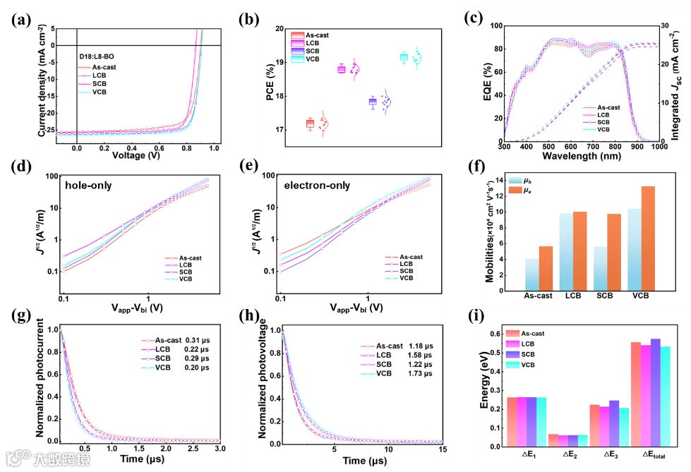 从三种不同形态的异构添加剂对OSCs器件光电性能影响的对比表征中,可以看到基于挥发性固体添加剂VCB的器件具有最优的激子解离与电荷提取效率,更加平衡的载流子迁移率与更低的开路电压损失,因此经VCB处理的D18:L8-BO和PM6:L8-BO为活性层的OSCs都实现了器件光电性能的显著提升,电池效率分别达到了19.33%和19.51%,优于LCB和SCB添加剂处理的器件。