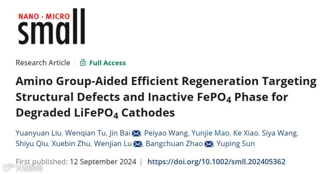 近日,中科院合肥物质科学研究院的赵邦传研究员等人在知名期刊Small上发表题为“Amino Group-Aided Efficient Regeneration Targeting Structural Defects and Inactive FePO4 Phase for Degraded LiFePO4Cathodes”的研究文章。文章报导了一种基于硫脲辅助固相烧结的无损回收技术来再生废旧LiFePO4正极材料,并探究了在LiFePO4再生过程中硫脲中氨基团对结构修复和失活相转化的增强作用机制。