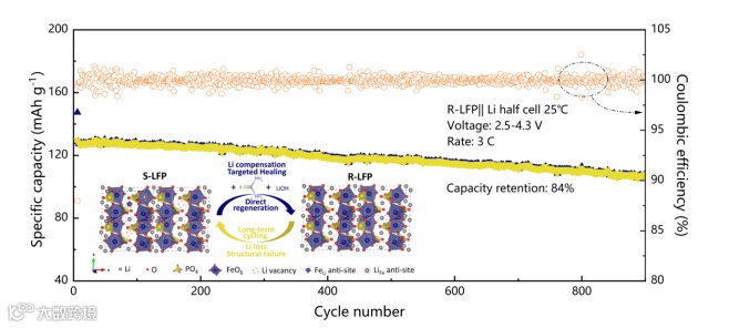 橄榄石型结构LiFePO4凭借其结构稳定等优点占据着锂离子动力电池正极材料的大半市场。其容量衰减通常是由于固体电解质界面膜的形成和长循环过程中副反应导致的晶体结构中锂的消耗造成的。形成的锂空位进一步导致晶体结构中三价铁的形成和铁向锂位的迁移(即Li-Fe“反位”缺陷),阻断了锂离子的输运通道,限制了电化学反应动力学,使得材料电化学性能显著衰减。目前直接再生是一种回收退化LiFePO4正极的高效策略,可以在不破坏其结构的情况下,直接将其成分和结构修复再生至初始状态。这不仅可以减少繁琐的回收工艺步骤,还能生产出高附加值的产品。
