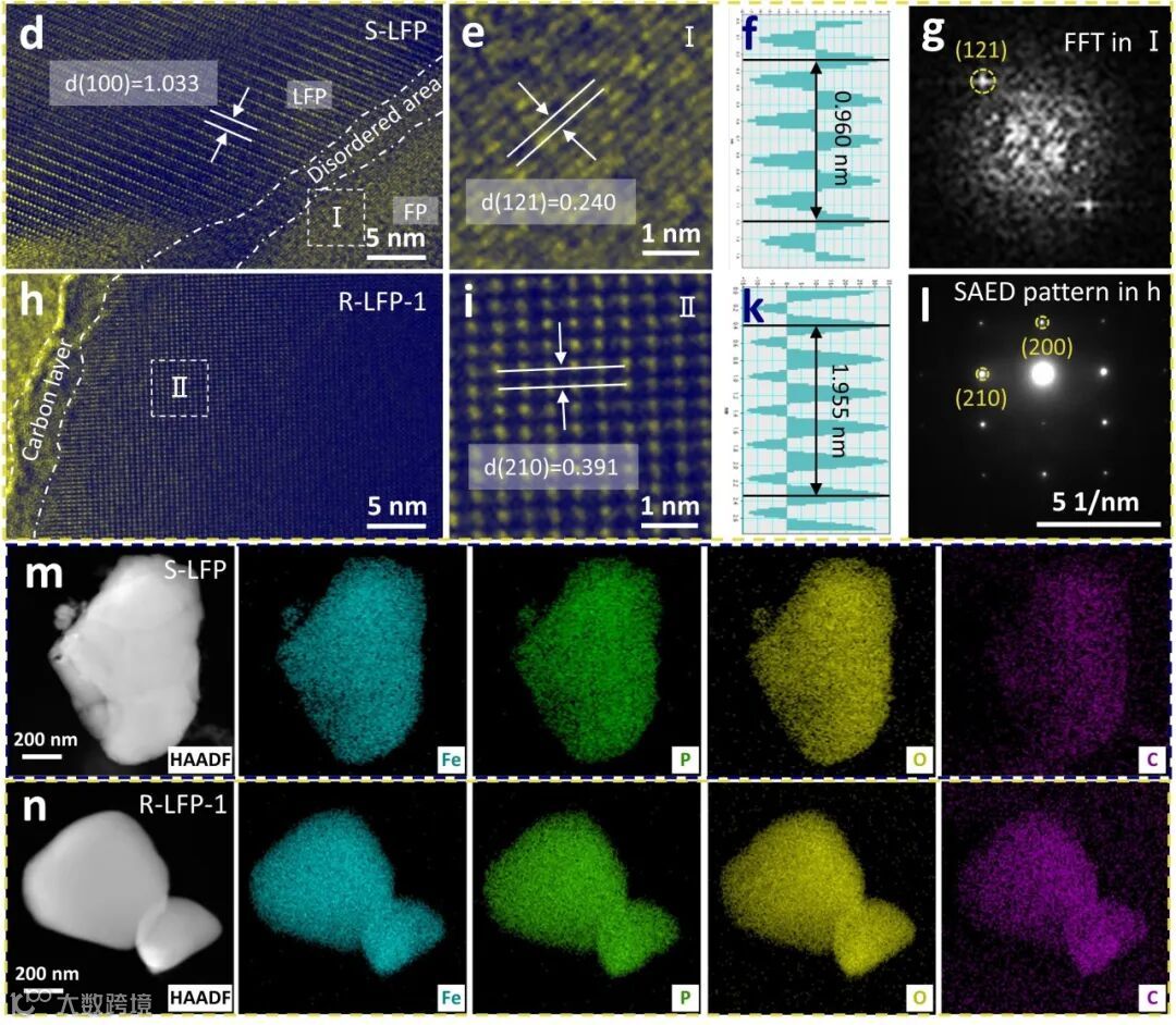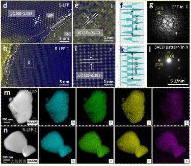 图1. R-LFP-1和S-LFP样品的HRTEM,SAED,HAADF-STEM和EDS图。