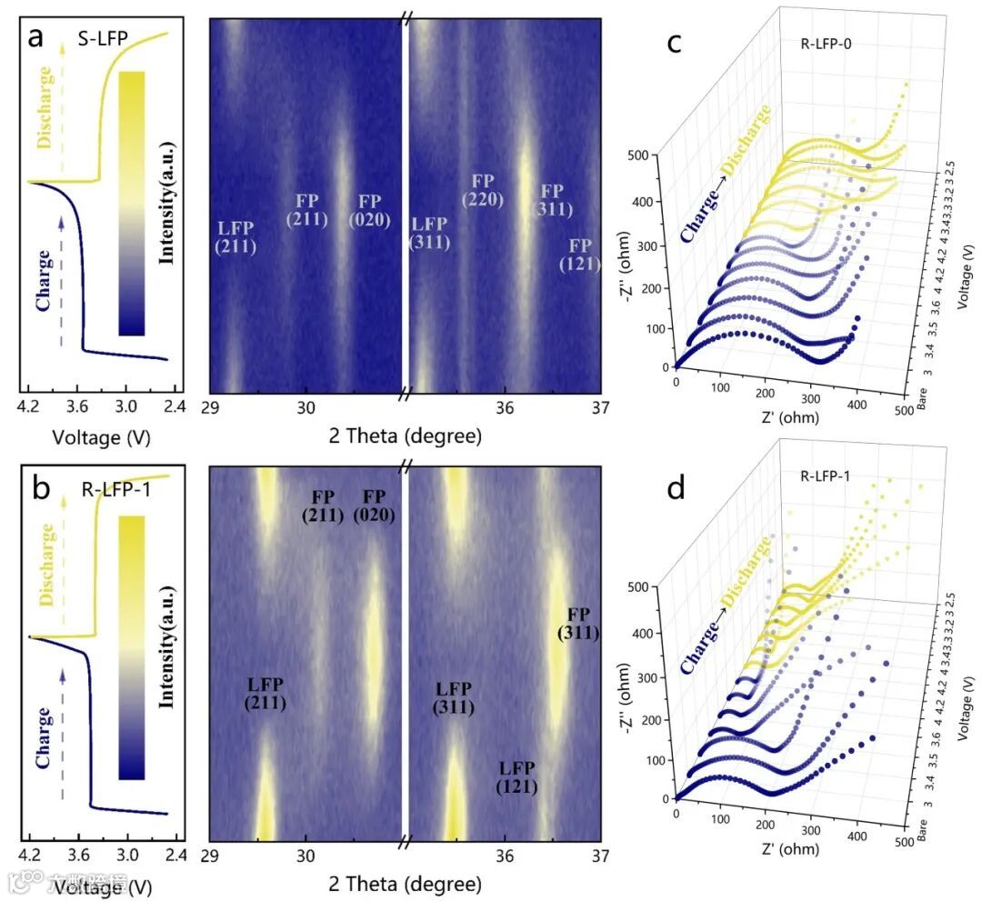 图3. R-LFP-1和S-LFP正极的原位XRD和EIS表征。