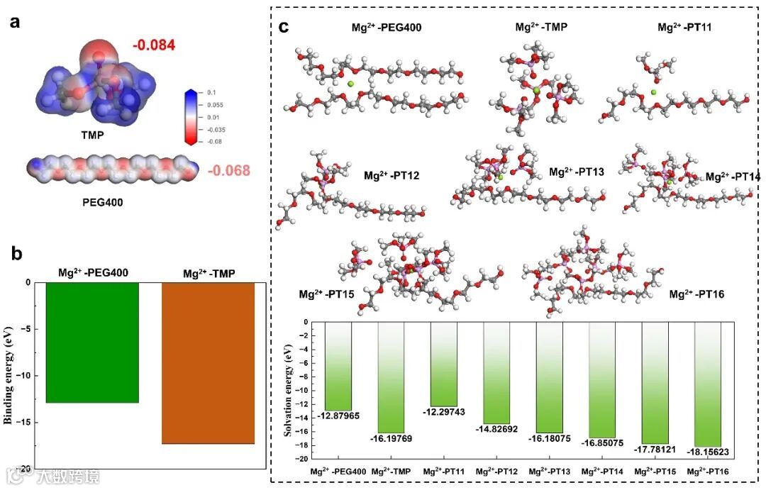 图2(a)PEG400 和 TMP 的 ESP 。(b) Mg2+-PEG400、Mg2+-TMP 对的结合能。(c) PT 溶液中可能的 Mg2+ 溶剂化结构和溶剂化能。