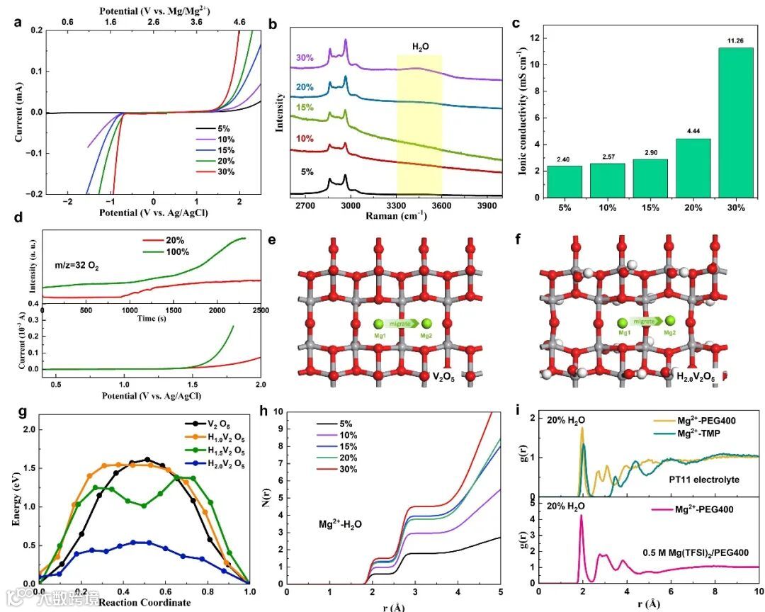 图3 不同含水量的LSV 曲线(a),拉曼光谱(b), 离子电导率(c)。(d)在 LSV 过程中,使用 20% 和 100% 含水量电解液产生氧气的原位 DEMS 信号。(e,f)Mg2+ 在 V2O5 和 H2V2O5 中的迁移路径。(g)Mg2+ 在 不同含氢量的V2O5中的迁移能。(h) 不同含水量电解质中Mg2+-H2O 的配位数。(i) 含 20% H2O 的 PT11 电解质中Mg2+-PEG400 和 Mg2+-TMP 对的 RDF(上图),以及 Mg2+-PEG400 在含 20% H2O 的 0.5 M Mg(TFSI)2/PEG400 中的 RDF(下图)。