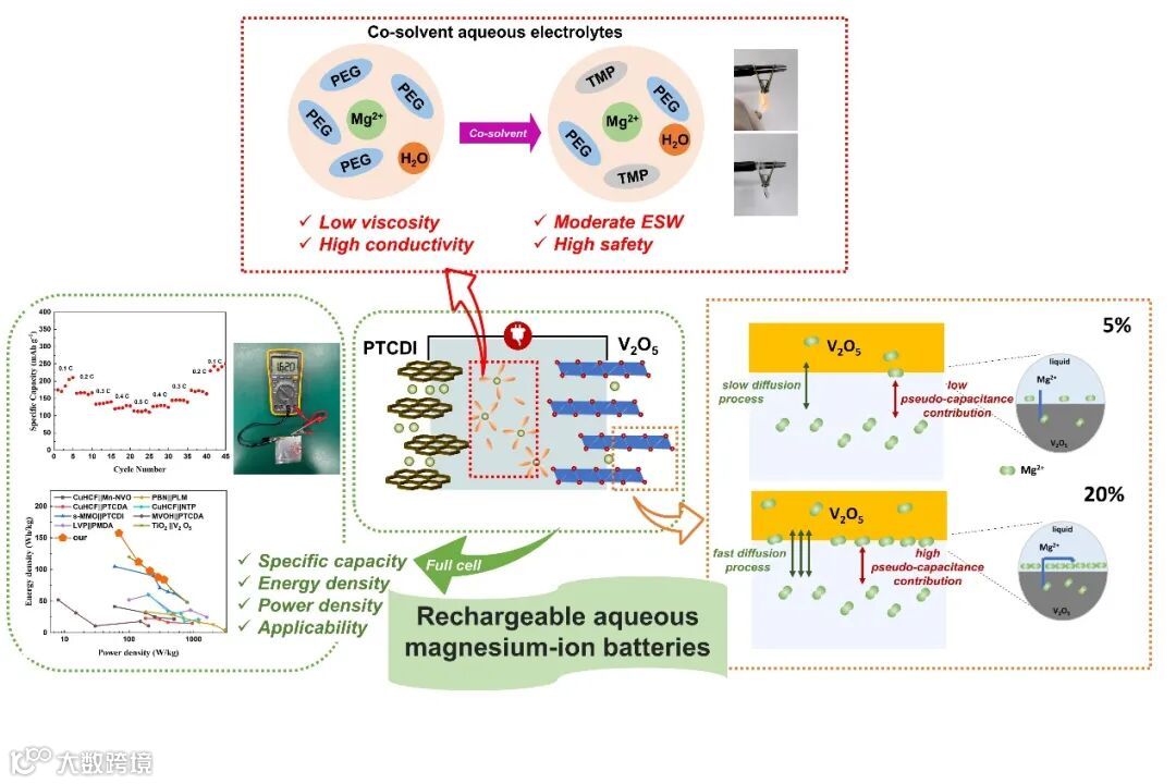 该论文主要研究了通过使用聚乙二醇和磷酸三甲酯作为共溶剂,改进水系镁离子电池的电解液配方,从而提升电池的性能。通过引入PEG和TMP的混合溶剂,显著提高了电解液的离子导电性,拓展了电化学稳定窗口,并在与V2O5正极和PTCDI负极的电池组合中展现了优异的电化学性能。该电池在高电流密度下仍保持较高的放电容量和能量密度,验证了新型共溶剂电解液对水系镁离子电池性能提升的可行性。