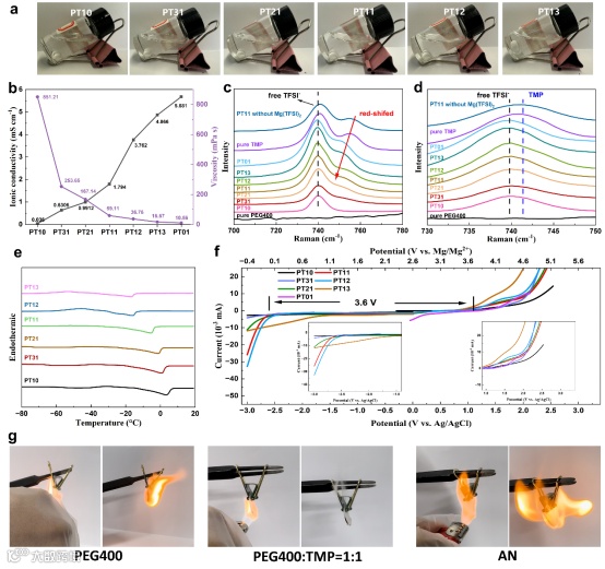 图1(a)制备的 0.5 M Mg(TFSI)2 溶液在不同 PEG400 和 TMP 下的光学照片。(b) 溶液的离子电导率和粘度。(c, d) 不同溶液的拉曼光谱。(e) P不同溶液的溶液的 DSC 数据。(f) 不同溶液的的 LSV 曲线。(g)可燃性测试。